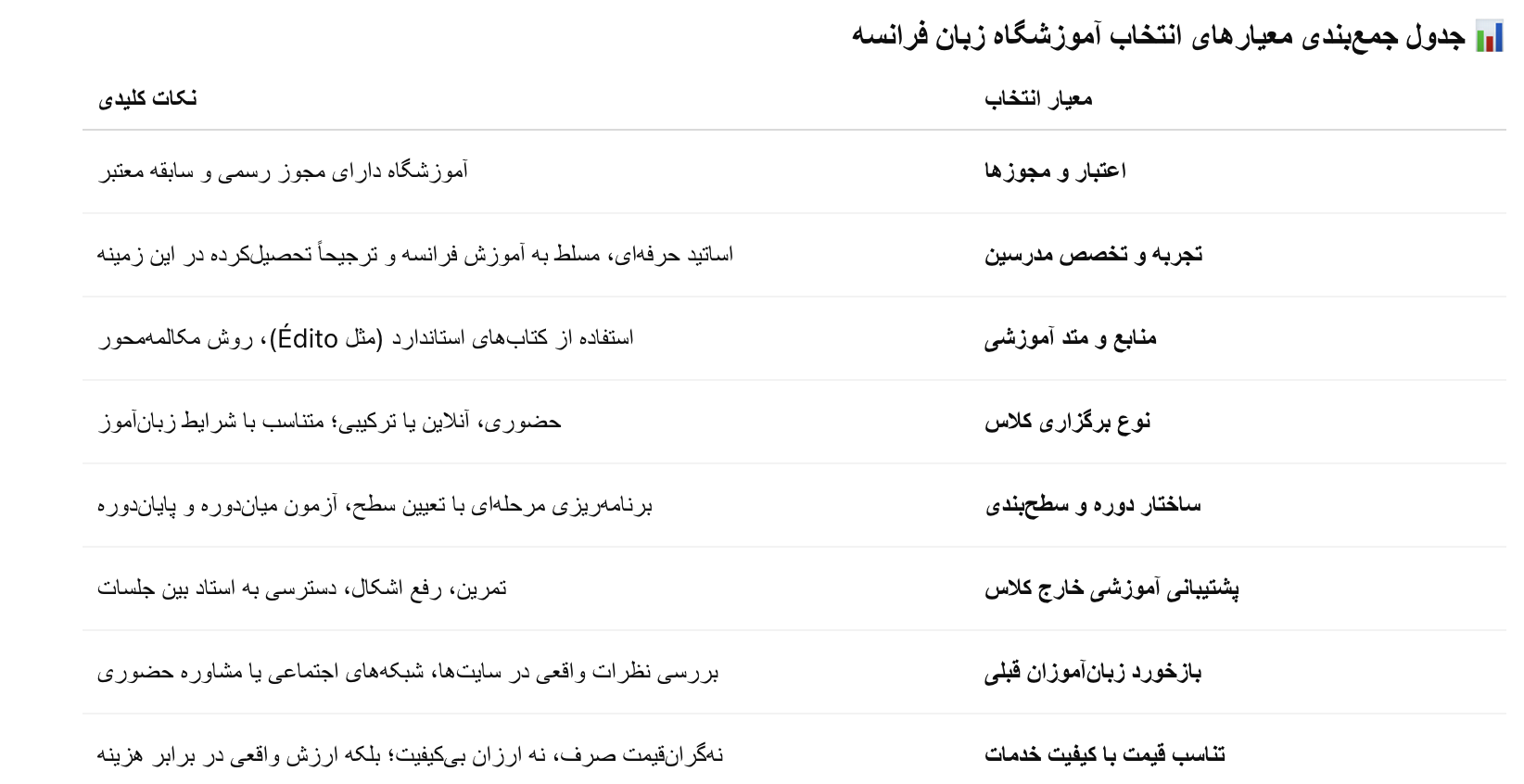 واقعیت این است که یک انتخاب نادرست میتواند منجر به دلسردی، اتلاف وقت، پرداخت هزینههای بینتیجه و حتی ترک مسیر یادگیری شود. اما از طرفی، با آگاهی از معیارهای کلیدی و بررسی دقیق آموزشگاهها، میتوان مسیر یادگیری زبان فرانسه را با اطمینان و انگیزه شروع کرد. شناخت نیاز شخصی، سبک یادگیری و هدف نهایی، اولین قدم در این مسیر است و انتخاب آموزشگاه باید دقیقاً بر اساس همین شناخت صورت بگیرد.