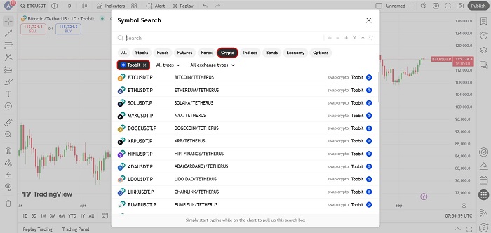 در این پنجره، ابتدا تب Crypto را انتخاب و سپس روی گزینه All Sources کلیک کنید. سپس در کادر جستوجو، عبارت Toobit را وارد کنید. با انتخاب این گزینه، فهرست جفت ارزهای معاملاتی بخش فیوچرز توبیت به نمایش درمیآید. کافی است جفت ارز معاملاتی مدنظرتان را برگزینید.