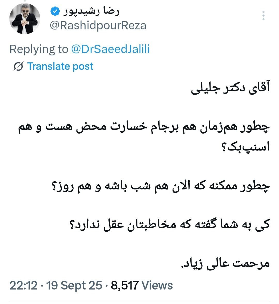 پیام کنایهآمیز رشیدپور به سعید جلیلی
