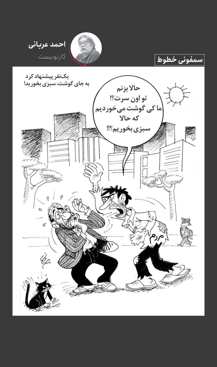 هم‌میهن: یک نفر پیشنهاد کرد به جای گوشت، سبزی بخورید! موضوعی که احمد عربانی در کاریکاتور خود، آن را به تصویر کشیده است.