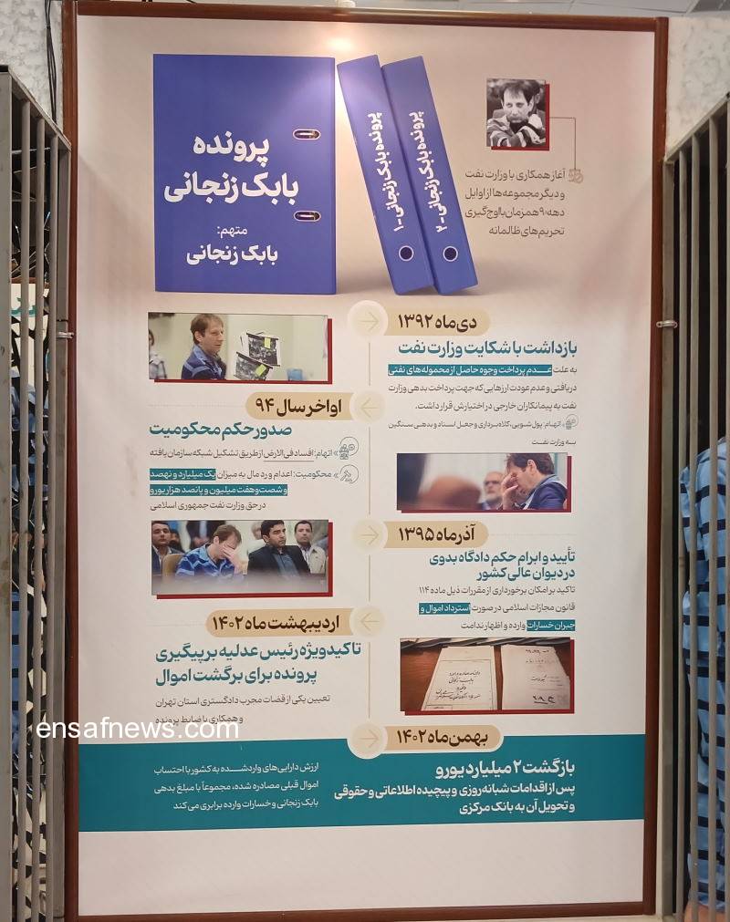 به عنوان مثال یکی از دیوارنگارهها به پروندهی بابک زنجانی و «تاکید ویژه رئیس عدلیه برای برگشت اموال در اردیبهشت ۱۴۰۲» اختصاص داشت.