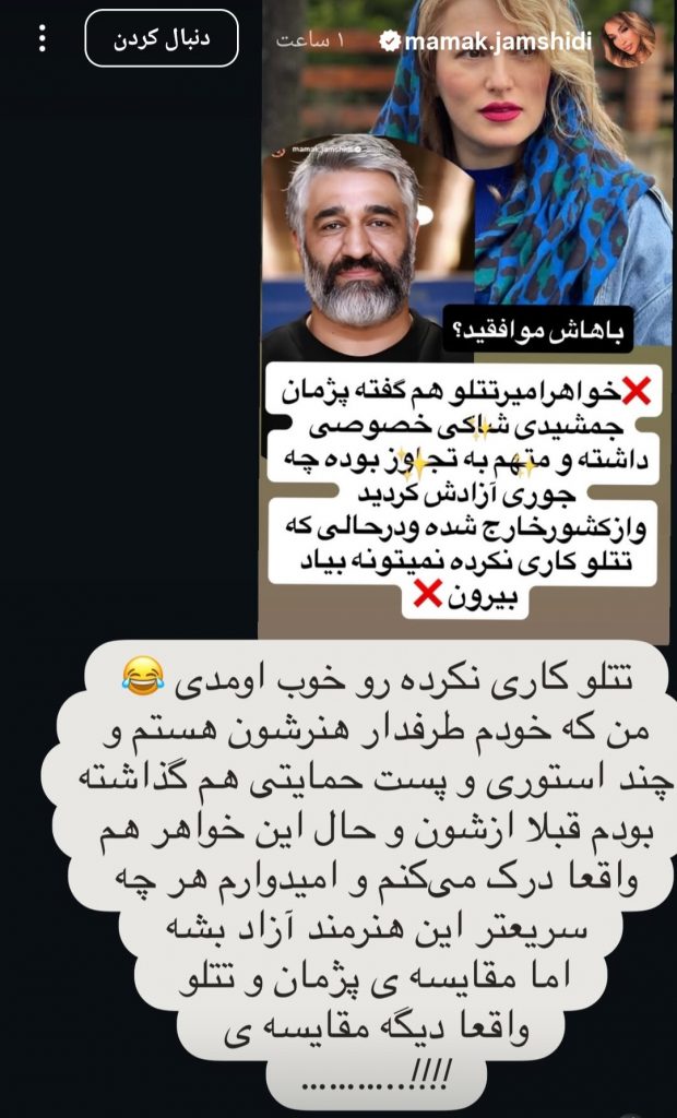 خواهر امیر تتلو وضعیت برادرش و پژمان جمشیدی را با هم مقایسه کرده، موضوعی که با واکنش مامک جمشیدی، خواهر پژمان مواجه شده است.