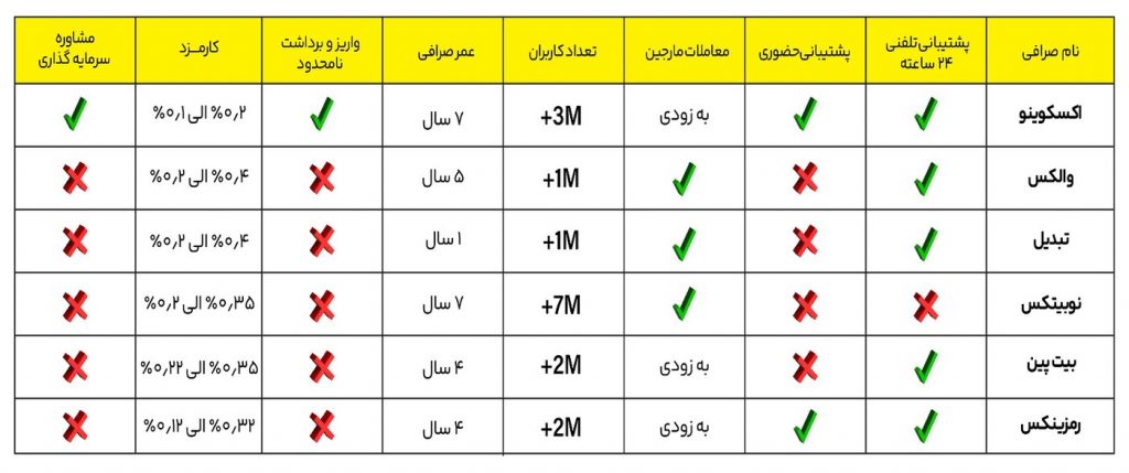 جدول مقایسه ویژگیهای صرافیهای ارز دیجیتال ایرانی