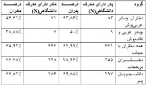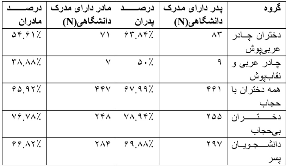 ۷۰٪ از پدران «دانشجویان پسر» دارای مدرک دانشگاهیاند. در میان «دختران با حجاب»، نرخ تحصیلات پدر برای «دختران با چادر عربی» به ۶۴٪ و برای «دختران با نقاب» به ۵۳٪ کاهش مییابد. نسبتهای مادران نیز تقریباً مشابه است. ۶۶٪ از مادران «دختران با حجاب» مدرک دانشگاهی دارند در حالی که ۷۷٪ از مادران «دختران بیحجاب» در دانشگاه درس خوانده اند. فقط ۵۷٪ از مادران «دختران چادر عربیپوش» و تنها ۴۰٪ از مادران «دختران نقابپوش» تحصیلات دانشگاهی دارند.