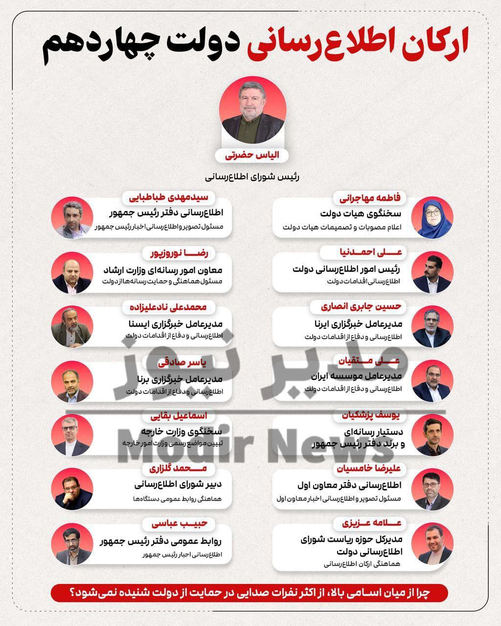 ۱. الیاس حضرتی در راس ارکان نیست و صرفا ریاست شورای اطلاع رسانی دولت را برعهده دارد. او و فاطمه مهاجرانی، به عنوان سخنگوی دولت، دو عضو همطراز در کابینه هستند.