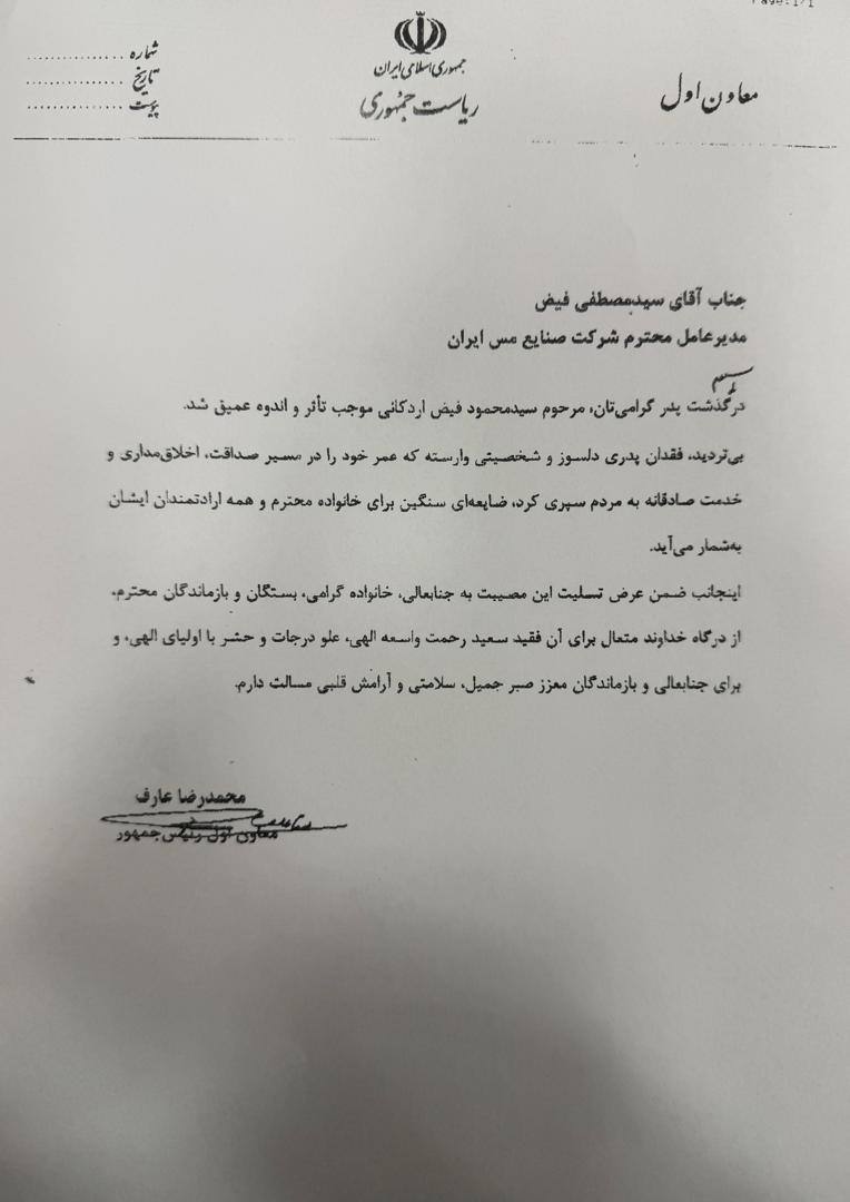 محمدرضا عارف، معاون اول رئیس جمهور در پیامی به مدیرعامل شرکت صنایع مس ایران درگذشت پدر او را تسلیت گفت.