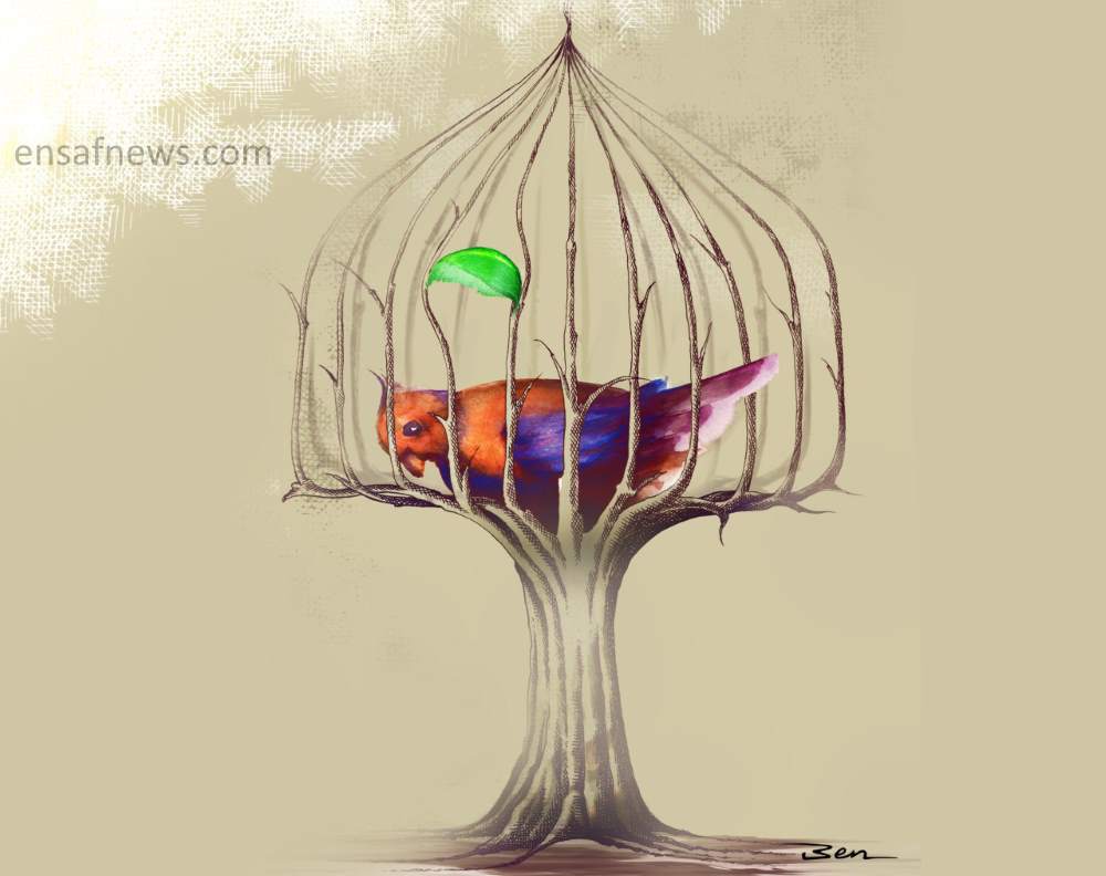 کارتونی از «بنیامین آل علی»، کارتونیست انصاف نیوز. کارتونیست برای آن عنوانی پیشنهاد نکرده است، اما به امید برای رفع اقامت اجباری! اشاره دارد.