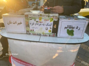 - جای دیگر که احتمالا بیارتباط است با کمیته امام، سه صندوق جمعآوری کمک گذاشته با سه عنوان متفاوت «خیرات نان» و «کمک به مردم غزه» و «رد مظالم». برای هر کدام، داوطلبانه و به مقدار دلخواه میتوان کارت کشید.