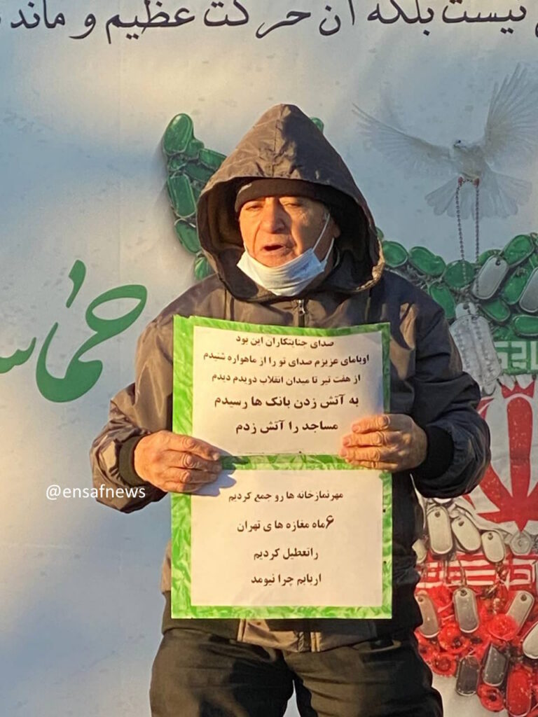 - پیرمردی لرزان و خمیده، از ابتدای مراسم جلوی جایگاه ایستاده بود. پلاکاردی در دست داشت که رویش نوشته شده بود: «صدای جنایتکاران این بود؛ اوبامای عزیزم صدای تو را از ماهواره شنیدم. از هفت تیر تا میدان انقلاب دویدم دیدم به آتش زدن بانکها رسیدم. مساجد را آتش زدم، مهر نمازخانهها را جمع کردیم، ۶ ماه مغازههای تهران را تعطیل کردیم، اربابم چرا نیومد»