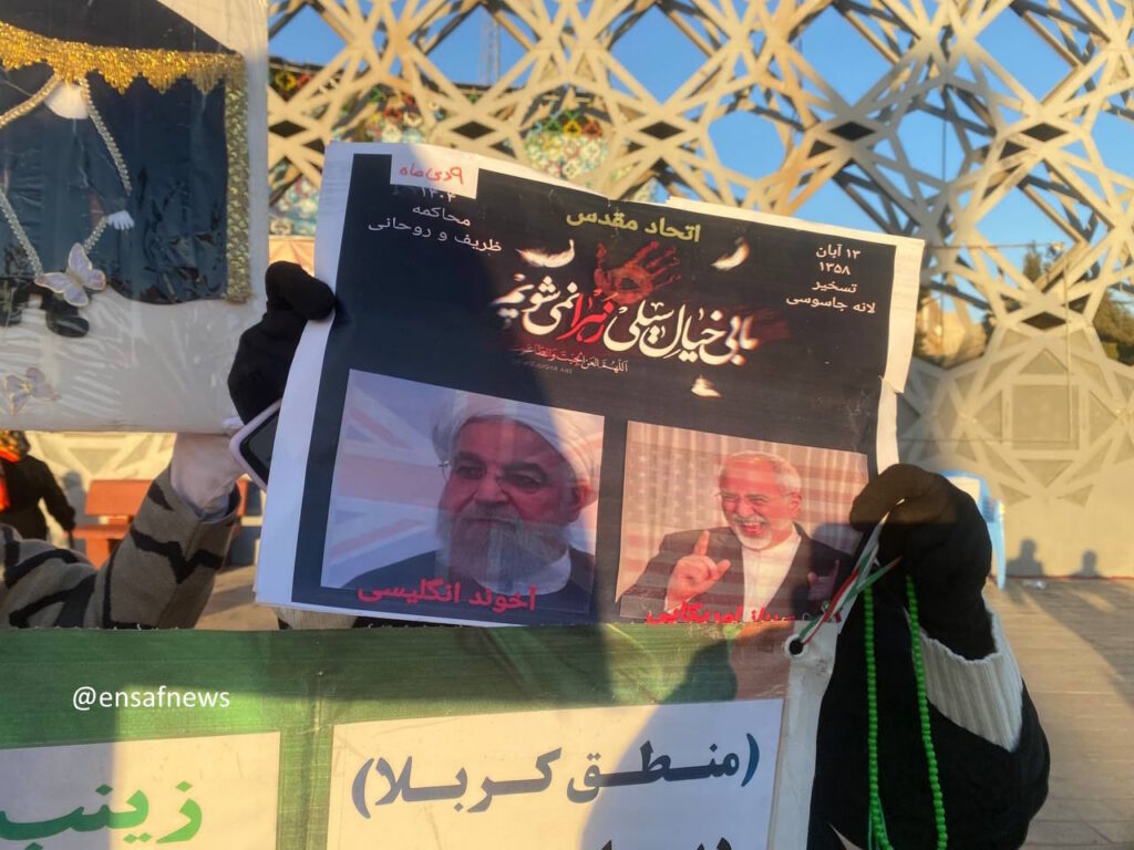 - طبق عرف معمول چنین مراسمی در یک دهه اخیر، حسن روحانی و محمدجواد ظریف از لعن و نفرین بینصیب نمیمانند؛ خانمی یک پلاکارد بزرگ برداشته که رئیسجمهور یازدهم و دوازدهم را روحانی انگلیسی خوانده و از «خیانت» وزیر خارجهی دولت روحانی شکایت کرده است!