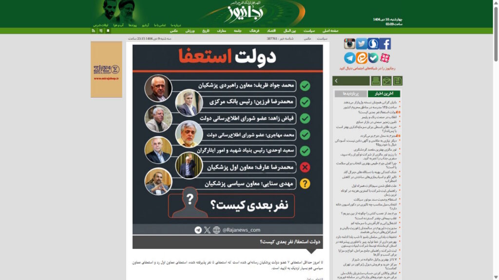«یادآوری استعفای چهار وزیر کابینه‌ی قبل در دو سال: عبدالملکی (کار)، نوری (آ. پ)، سجادی (ورزش)، اوجی (نفت/پذیرفته نشد).