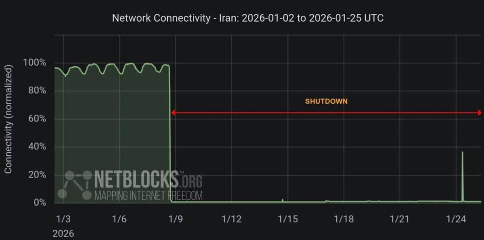 به گزارش انصاف نیوز به نقل از خبرآنلاین، «این نمودار که کاهش سطح دسترسی به اینترنت بینالملل را به سطحی نزدیک به صفر نشان میدهد، بیانگر یکی از طولانیترین و عمیقترین اختلالات ارتباطی در تاریخ کشور است.»