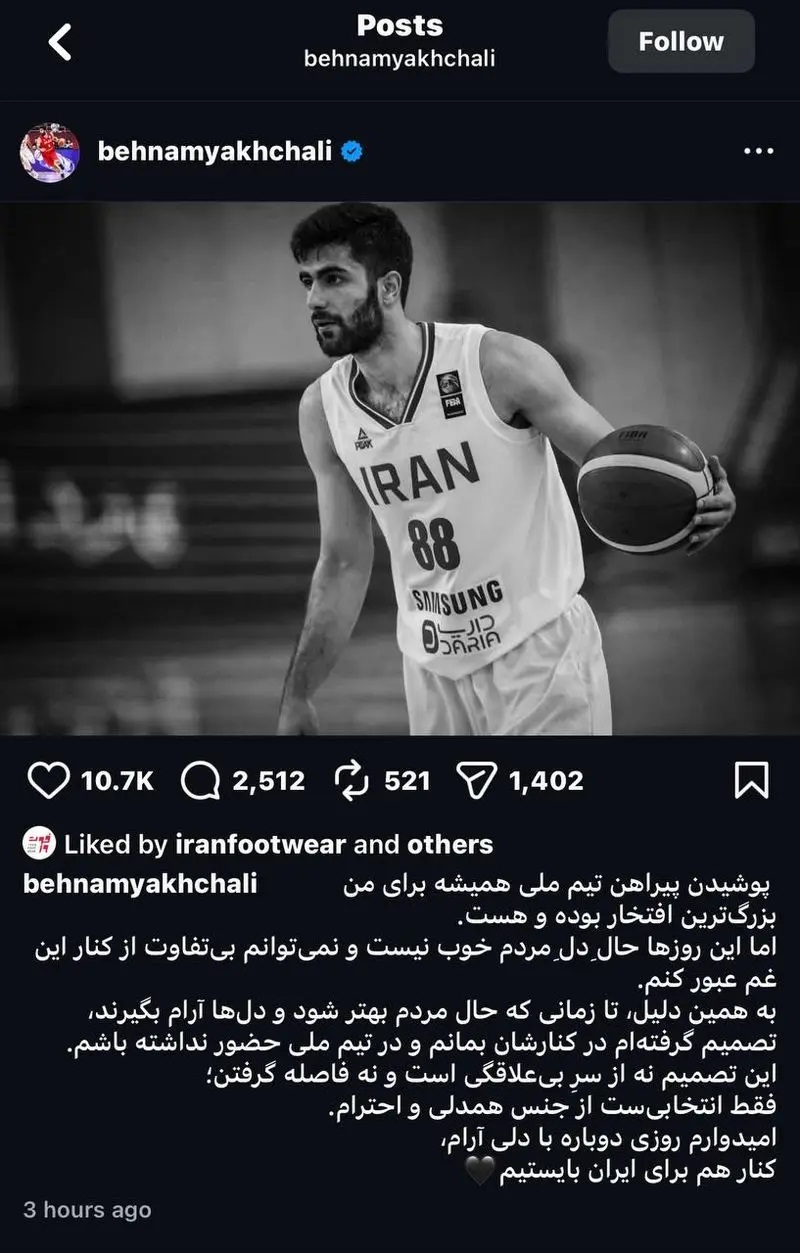 دیروز نیز، بهنام یخچالی، ملی پوش بسکتبال ایران و عضو باشگاه گلادیاتور ترایزر آلمان با انتشار پستی اینستاگرامی نوشت: پوشیدن پیراهن تیم ملی همیشه برای من بزرگترین افتخار بوده و هست؛ اما این روزها حالِ دلِ مردم خوب نیست و نمیتوانم بیتفاوت از کنار این غم عبور کنم. به همین دلیل، تا زمانی که حال مردم بهتر شود و دلها آرام بگیرند. تصمیم گرفتهام در کنارشان بمانم و در تیم ملی حضور نداشته باشم. این تصمیم نه از سرِ بیعلاقگی است و نه فاصله گرفتن؛ فقط انتخابیست از جنس همدلی و احترام. امیدوارم روزی دوباره با دلی آرام، کنار هم برای ایران بایستیم.