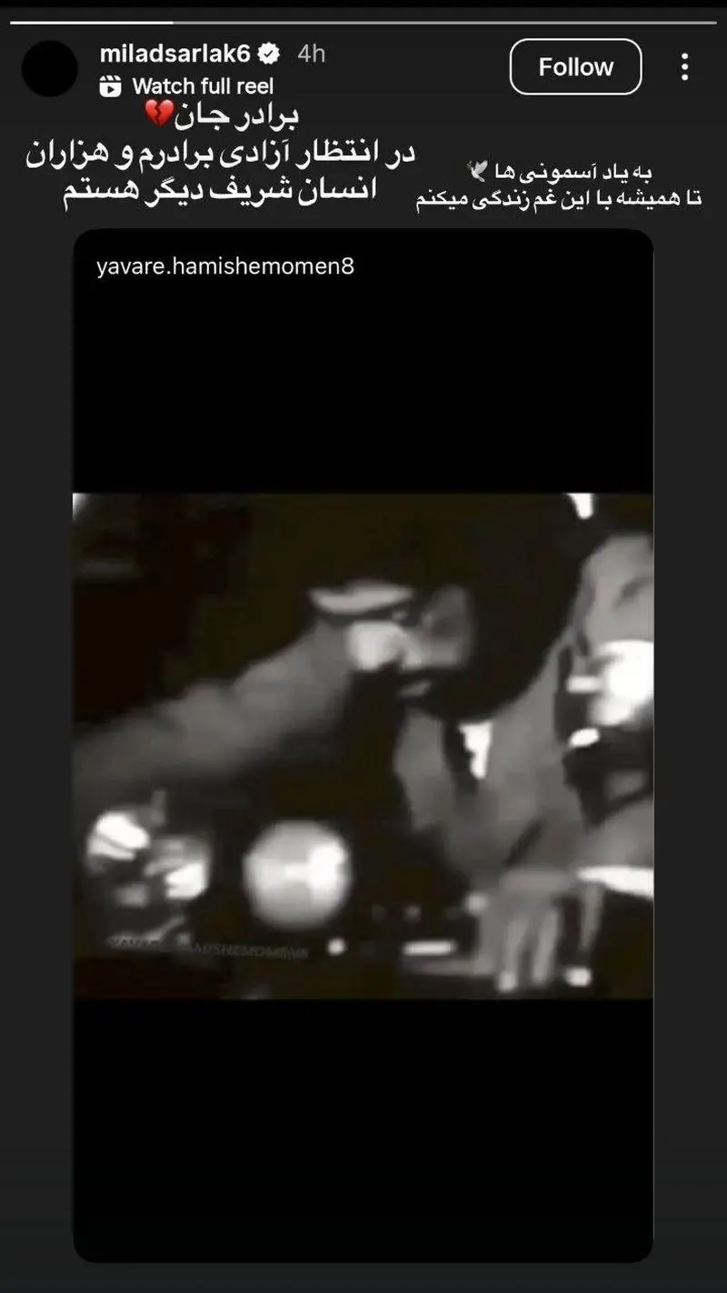 میلاد سرلک، هافبک باشگاه پرسپولیس، با انتشار یک استوری در صفحه شخصی خود به اتفاقات اخیر کشور و فضای احساسی شکل گرفتهی پس از آن در جامعه واکنش نشان داد. سرلک در این استوری نوشت: «برادر جان. در انتظار آزادی برادرم و انسانهای شریف هستم. به یاد آسمونیها تا همیشه با این غم زندگی میکنم.» و همچنین با انتشار نماد قلب شکستهی قرمز، با مردم ابراز همدردی کرد.این استوری در حالی منتشر شده که طی روزهای اخیر، واکنش چهرههای مختلف ورزشی و هنری به شرایط اجتماعی کشور افزایش یافته و برخی ورزشکاران تلاش کردهاند از طریق صفحات شخصی خود، پیامهای همدلی و حمایت منتشر کنند.میلاد سرلک که طی سالهای اخیر یکی از بازیکنان ثابت پرسپولیس و از چهرههای شناختهشده فوتبال ایران بوده، توضیح تکمیلی درباره این استوری منتشر نکرده است.