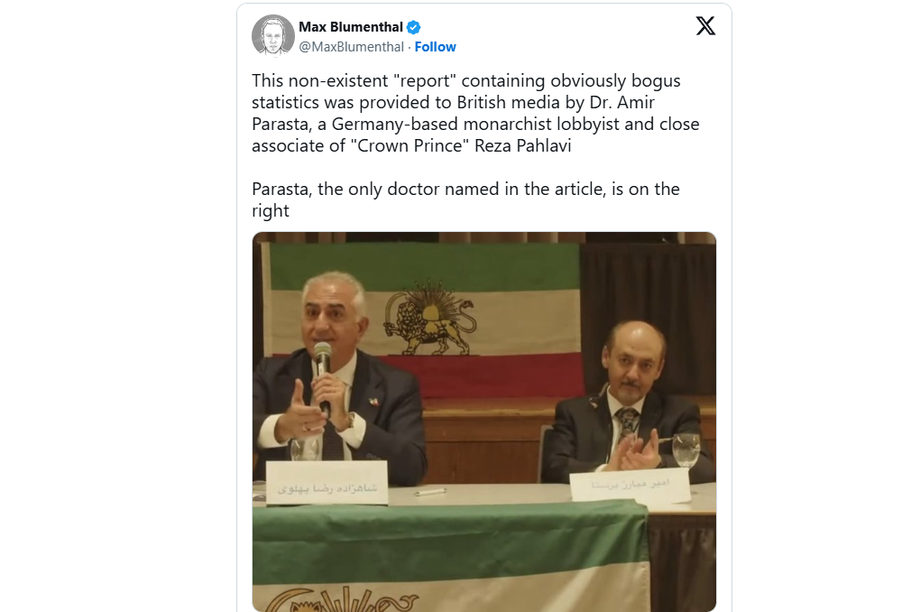 پشت پرده منبع آمار: ادعای ۳۰ هزار کشته نخستین بار توسط مجله تایم مطرح شد و گفته شد این رقم را دو مقام وزارت بهداشت ایران ارائه دادهاند. تایم ادعا کرده که این رقم با محاسبات یک چشمپزشک مقیم آلمان به نام «امیر پرستا» همخوانی دارد. اما گریزون افشا میکند که امیر پرستا، منبعی است که در اصطلاح اطلاعاتی «وابسته» است. او مشاوری نزدیک و لابیگری برای «رضا پهلوی» است و برای گروه لابی سلطنتطلب (اتحادیه ملی برای دموکراسی در ایران NUFDI )در آمریکا کار میکند. بنابراین، منبع اصلی این آمار، یک فعال سلطنتطلب وابسته است.