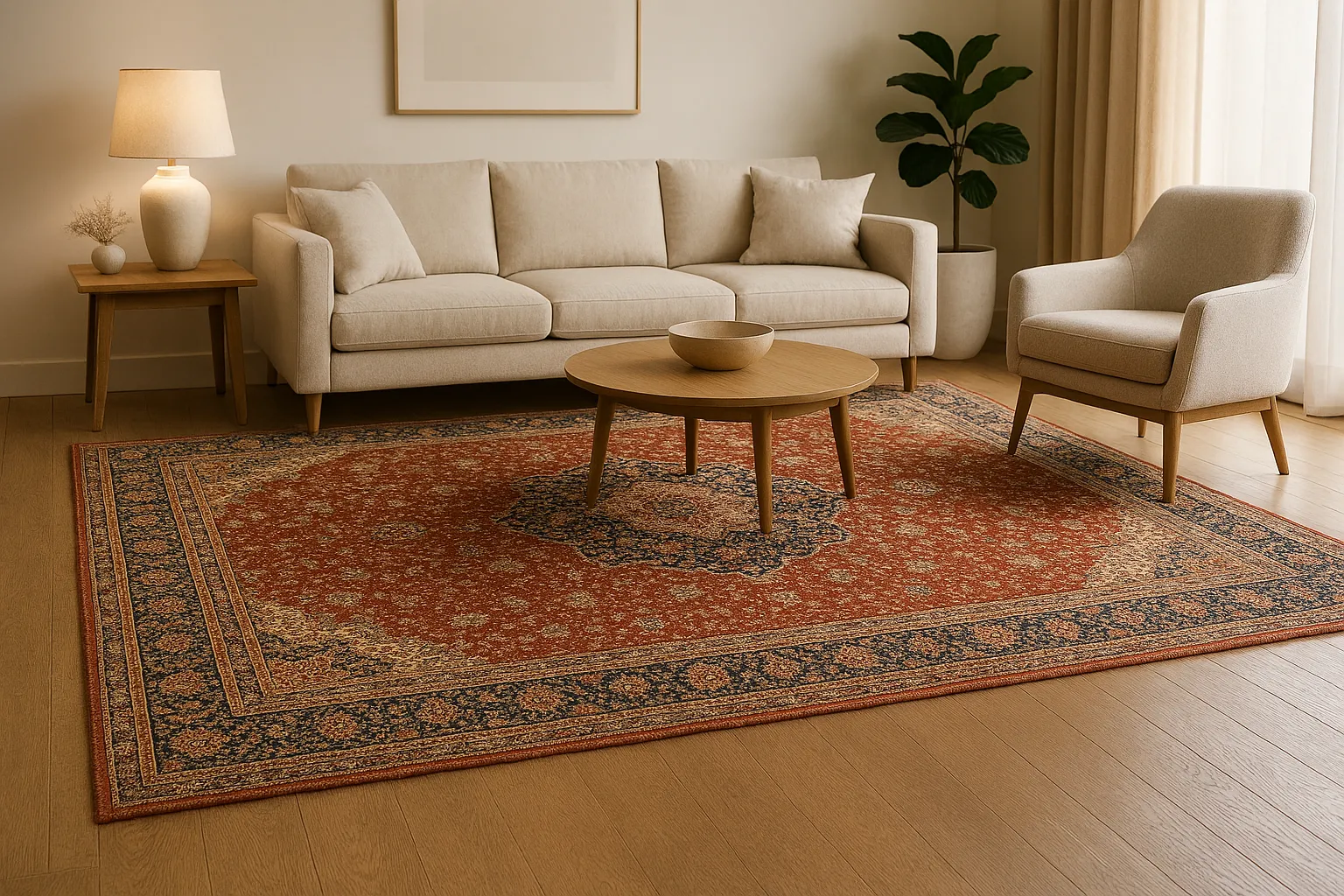- فاصله از دیوار: بین لبه فرش و دیوار باید حدود ۲۰ تا ۴۰ سانتیمتر فاصله باشد تا پارکت یا کفپوش زیرین زیبایی خود را نشان دهد. رعایت این استانداردها باعث میشود فضای پذیرایی شما از نظر بصری منظم و حرفهای چیده شده به نظر برسد.