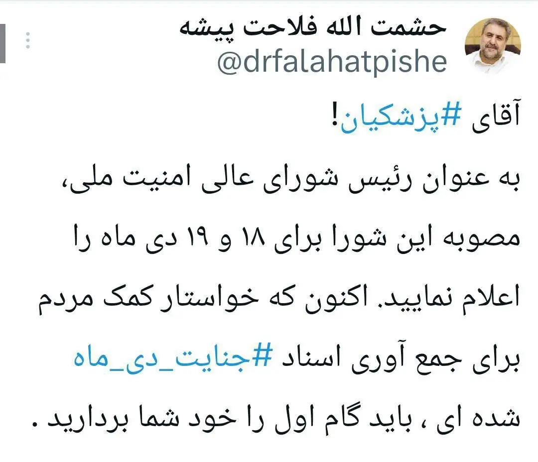 خبرآنلاین: حشمت الله فلاحت پیشه رئیس پیشین کمیسیون امنیت و سیاست خارجی ، در شبکه اجتماعی ایکس در واکنش به دستور پزشکیان برای بررسی اتفاقات ۱۸ و ۱۹ دی ماه نوشت: