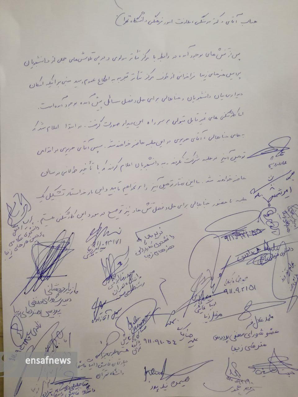 «مرتضی جلیل دوست» یکی از امضا کنندگان نامه و سرپرست گروه نمایش «مجلس مختلف خوانی» در تماسی با خبرنگار انصاف نیوز گفت: من و پنج نفر از اعضای گروهم یعنی «امیر شمس»، «عماد درویشی»، «بهرام تیغ نورد»، «صبا نجاتی» و «مصطفی امیری» بعد از اجرایمان دیدیم که نامه ای بسیار دوستانه در لابی تالار مولوی است که محتوای آن درخواست جلسه با آقای سرسنگی معاون فرهنگی دانشگاه است. ما آن را امضا کردیم اما نمی‌دانستیم این بچه ها به مسایل مختلفی از جمله نحوه اجرای فراخوان تالار اعتراض دارند.