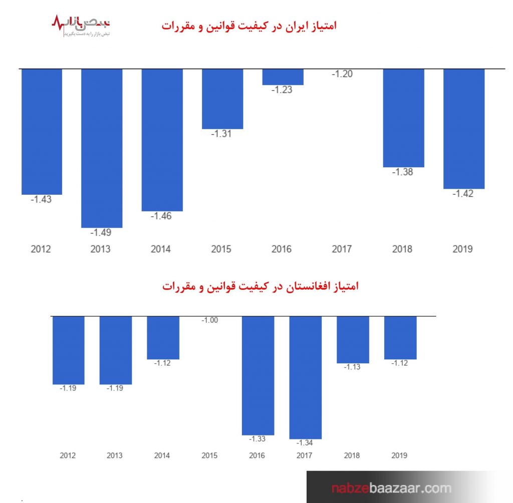 رتبه ایران در سال ۲۰۱۹ در شاخص کیفیت قوانین و مقررات در بین ۱۹۲ کشور مورد بررسی توسط بانک جهانی ۱۸۰ بوده است. شاخص کیفیت مقررات یک رویکرد کمی برای اندازه گیری کیفیت قوانین اساسی و ثانویه در چهارچوب نظارتی اروپا می باشد. این شاخص، ابزارهایی را برای شناسایی نقاط ضعف یک محیط نظارتی و همچنین تجزیه و تحلیل و مقایسه آن با کشورهای مختلف ارائه میدهد.