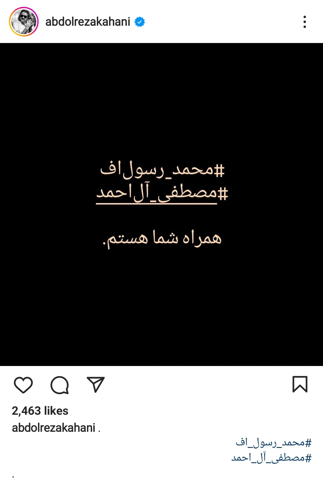عبدالرضا کاهانی، کارگردان سینما در پی بازداشت مصطفی آل احمد و محمد رسولاف پستی در اینستاگرام منتشر کرد.