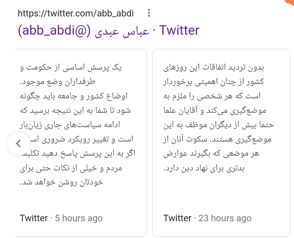 عباس عبدی در توییتر خود نوشت: بدون تردید اتفاقات این روزهای کشور از چنان اهمیتی برخوردار است که هر شخصی را ملزم به موضع گیری میکند و آقایان علما حتما بیش از دیگران موظف به این موضع گیری هستند. سکوت آنان از هر موضعی که بگیرند عوارض بدتری برای نهاد دین دارد.