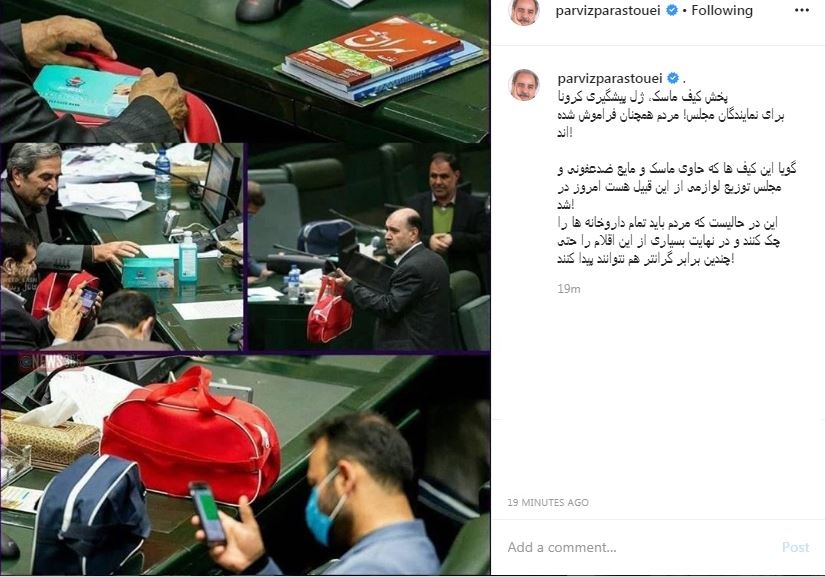 پرویز پرستویی با انتشار عکسی در صفحه اینستاگرام خود، به پخش ماسک و ژل عفونیکننده در مجلس انتقاداتی وارد کرد.