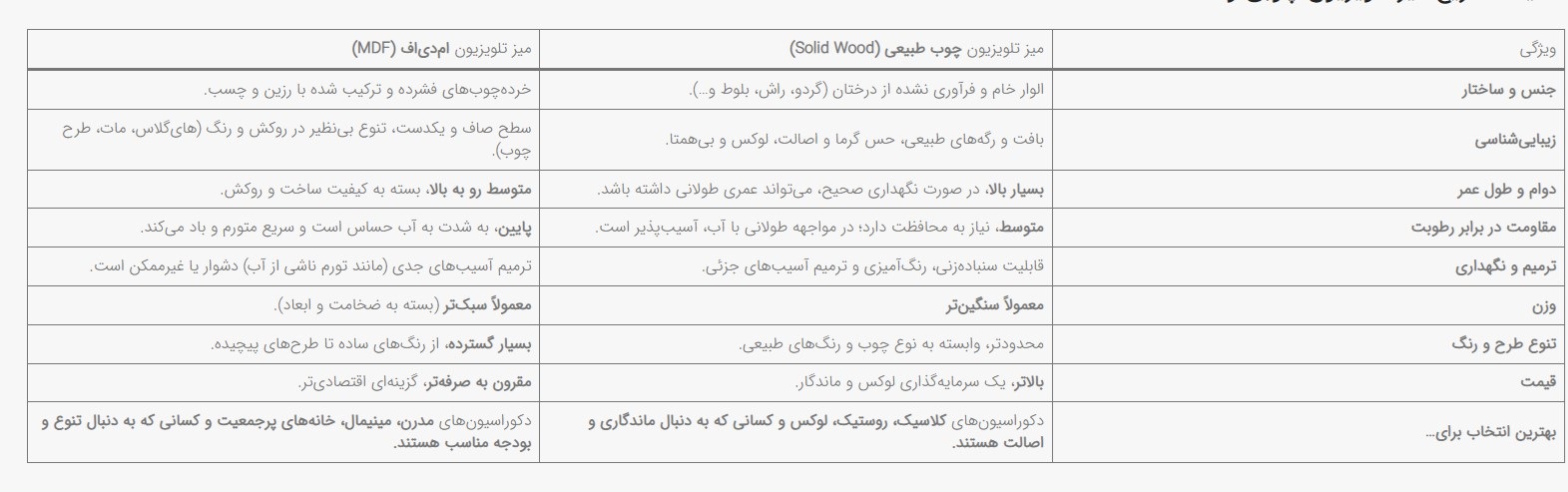 مقایسه سریع میز تلویزیون چوبی و ام دی اف