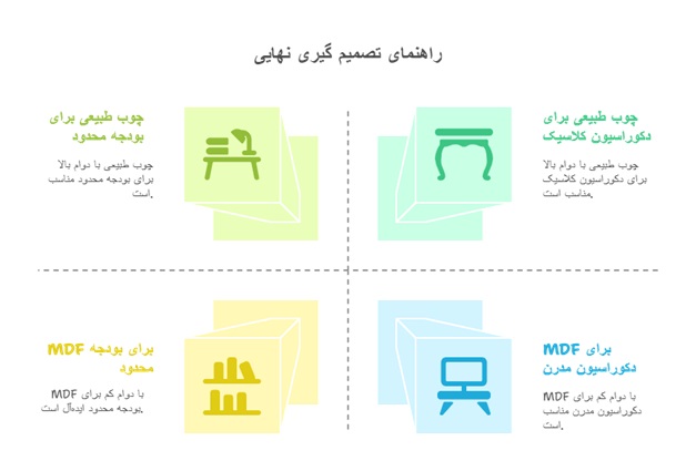 - اگر به دنبال تنوع در طراحی، رنگهای مدرن و قیمتی مناسبتر هستید و نگهداری آسانتر برایتان مهم است، MDF گزینه مناسبی خواهد بود.