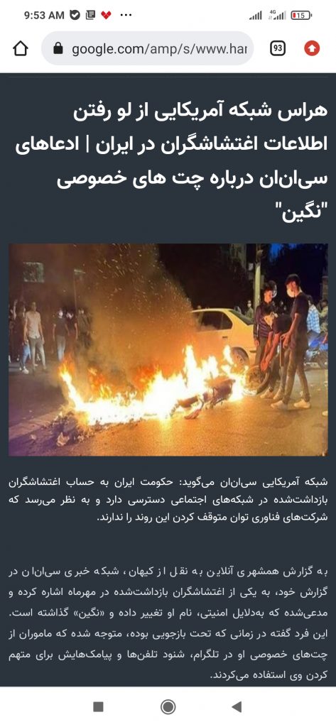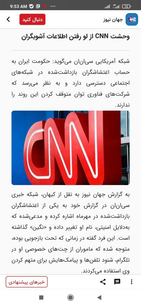 به گزارش همشهری آنلاین به نقل از کیهان، شبکه خبری سیانان در گزارش خود، به یکی از «اغتشاشگران» بازداشتشده در مهرماه اشاره کرده و مدعیشده که بهدلایل امنیتی، نام او تغییر داده و «نگین» گذاشته است. این فرد گفته در زمانی که تحت بازجویی بوده، متوجه شده که ماموران از چتهای خصوصی او در تلگرام، شنود تلفنها و پیامکهایش برای متهم کردن وی استفاده میکردند.